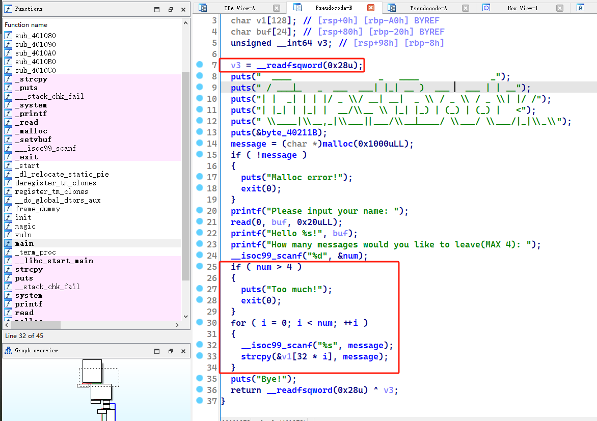 找到system("/bin/sh")返回地址,发现是先进行覆盖,同时payload要利用泄露的Canary不破坏栈上的Canary在利用第二次输入,将Canary的\x00字节通过strcpy复制时自动末尾补恢复Canary,触发ret2text来getshell